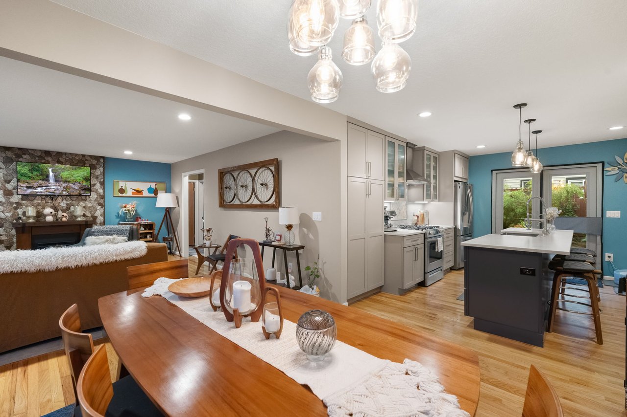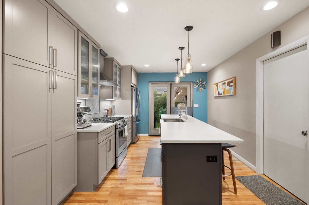 The spacious living room connects seamlessly to the dining area, creating an ideal setting for lively get-togethers or relaxed evenings by the electric fireplace. The 2019 kitchen remodel is a showstopper with updated electrical, soft-close cabinetry with pantry storage, an island, honed quartz counters, stainless steel appliances, and French doors leading straight to the backyard patio, perfect for weekend brunches or evening gatherings.