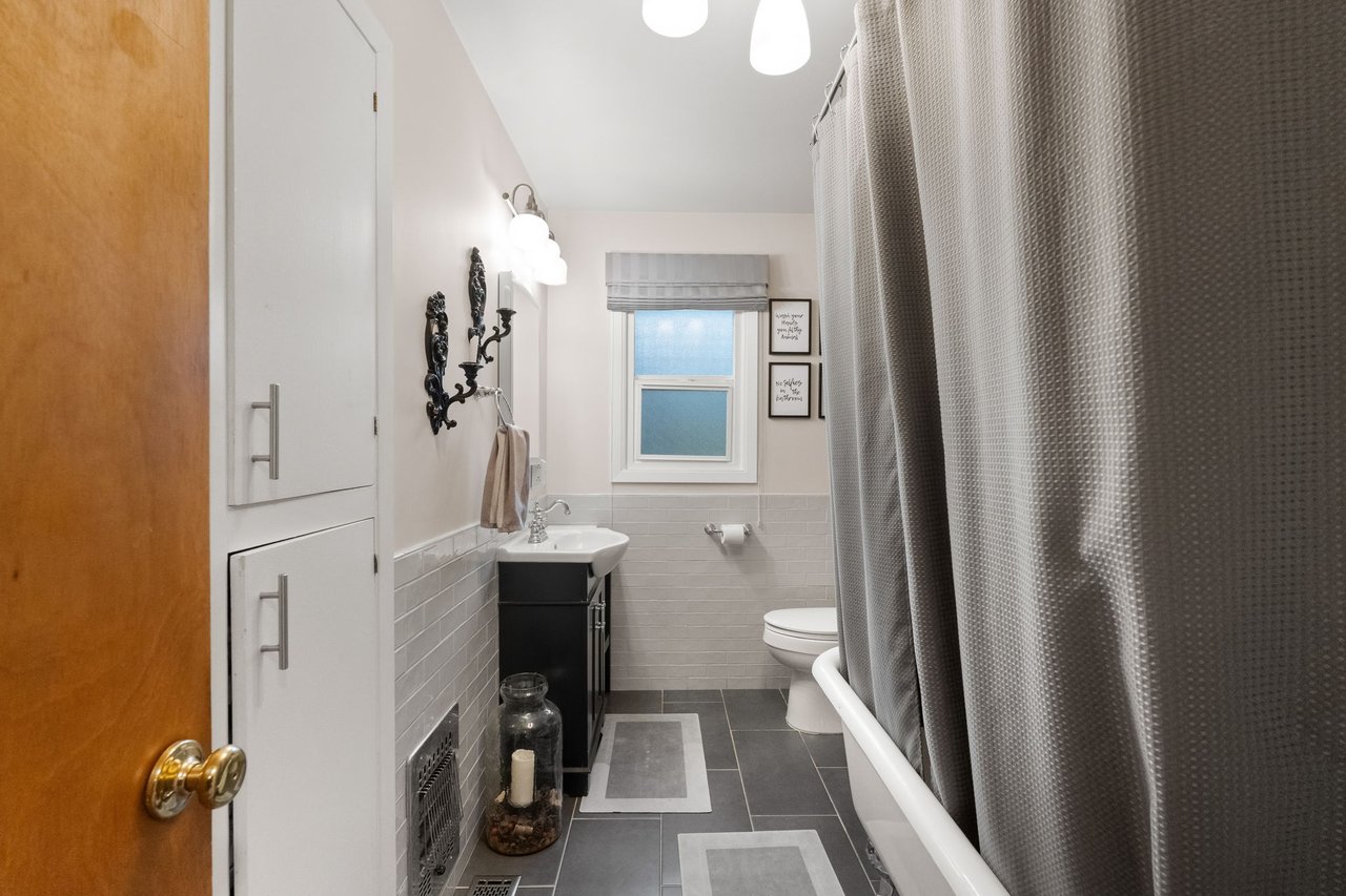 Three bedrooms share a remodeled hallway bathroom featuring a clawfoot tub, custom tilework, and a heated towel rack.