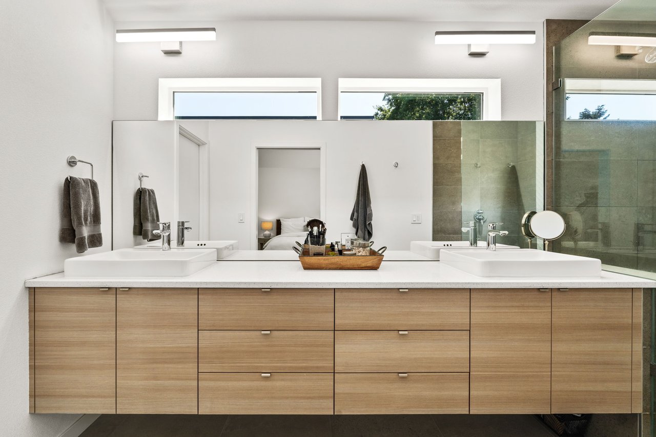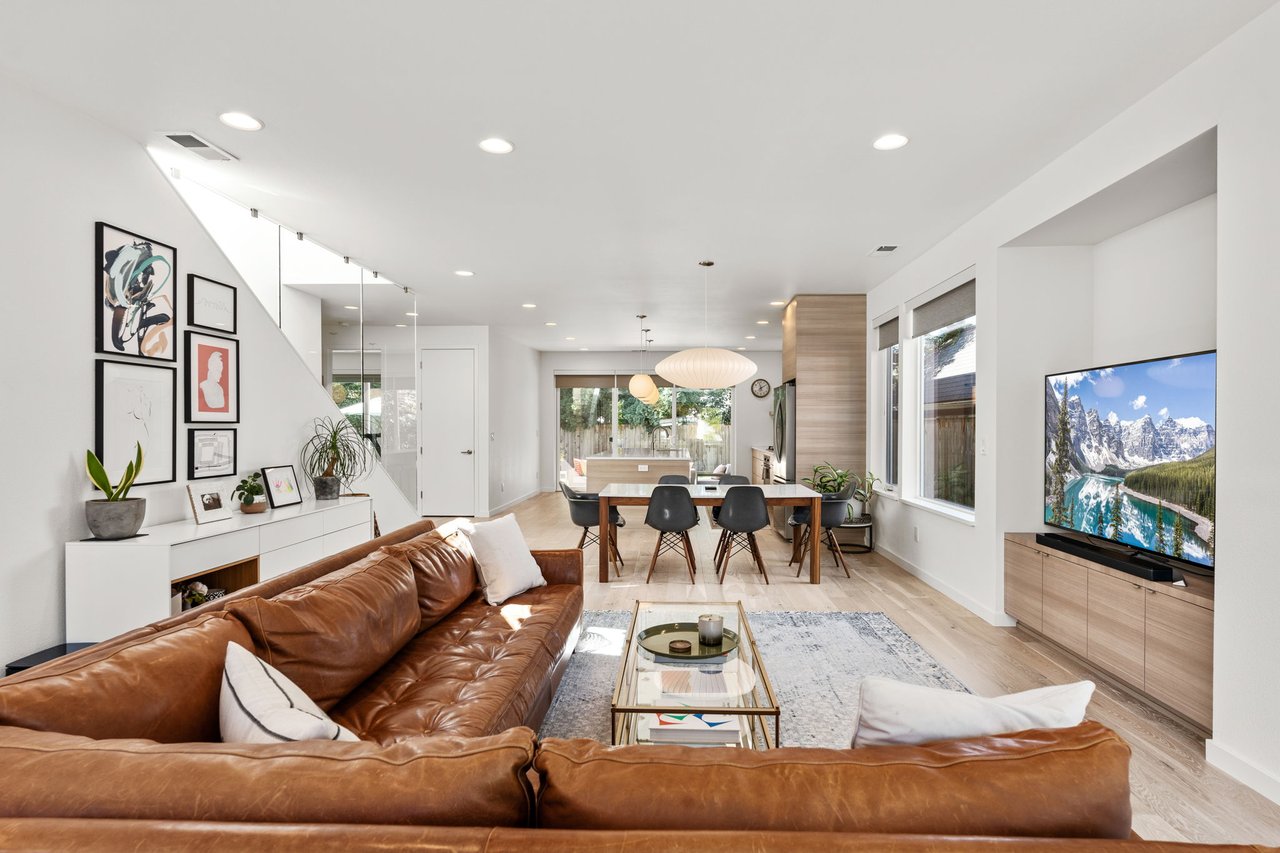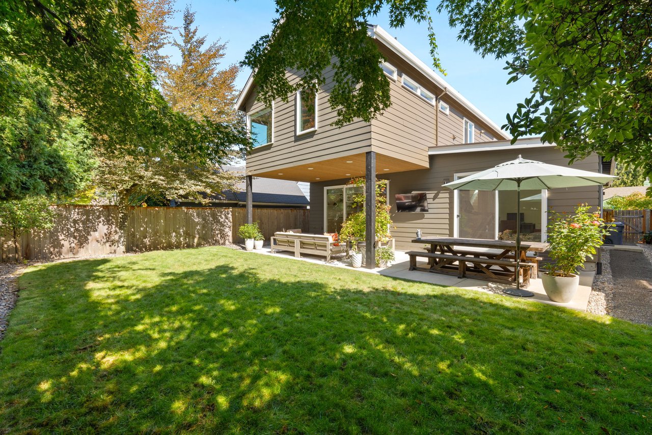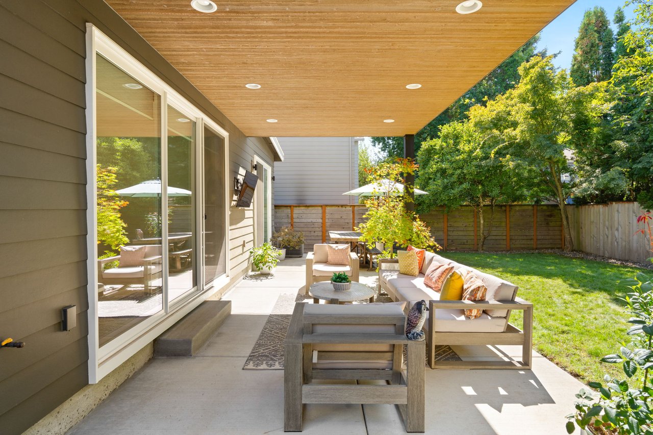 The secluded backyard is designed for entertaining with a covered patio featuring a wood-clad ceiling, recessed lighting, and TV hookup, all framed by lush landscaping and a Hunter irrigation system. Blending elevated design with everyday comfort, this exceptional home offers the perfect balance of modern luxury and enduring craftsmanship.