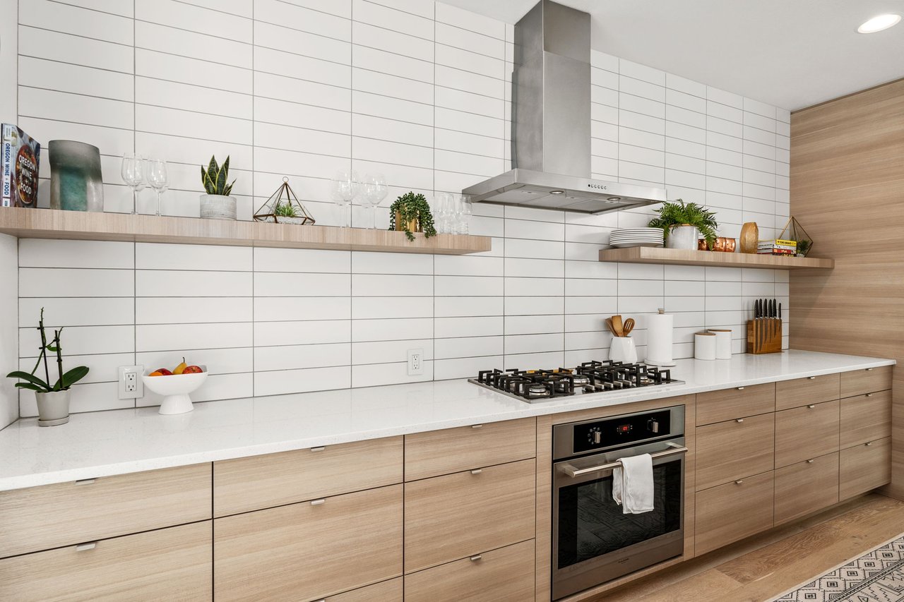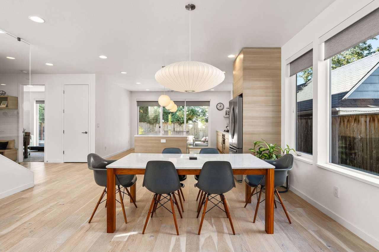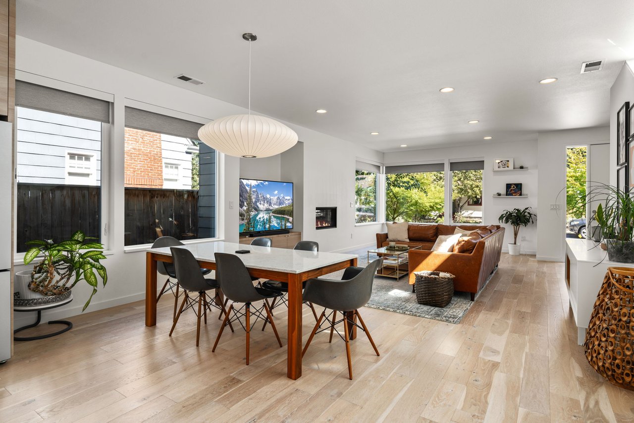 This sophisticated modern residence in Arbor Lodge is defined by exceptional attention to detail and designer-selected finishes. A thoughtfully designed open floor plan showcases white oak engineered hardwood flooring, Norman shades, and Herman Miller lighting, setting a refined tone throughout the space. The living room offers a gas fireplace and a built-in TV niche, flowing seamlessly into a dining area and a gourmet kitchen that exceeds expectations. Equipped with premium stainless steel appliances, including a Fulgor Milano 5-burner cooktop, the kitchen features quartz countertops, a ceiling-to-counter tile backsplash, an expansive 5-seat island with storage, and a walk-in pantry. Oversized sliding doors invite natural light and open to a covered patio, creating an effortless indoor-outdoor connection.