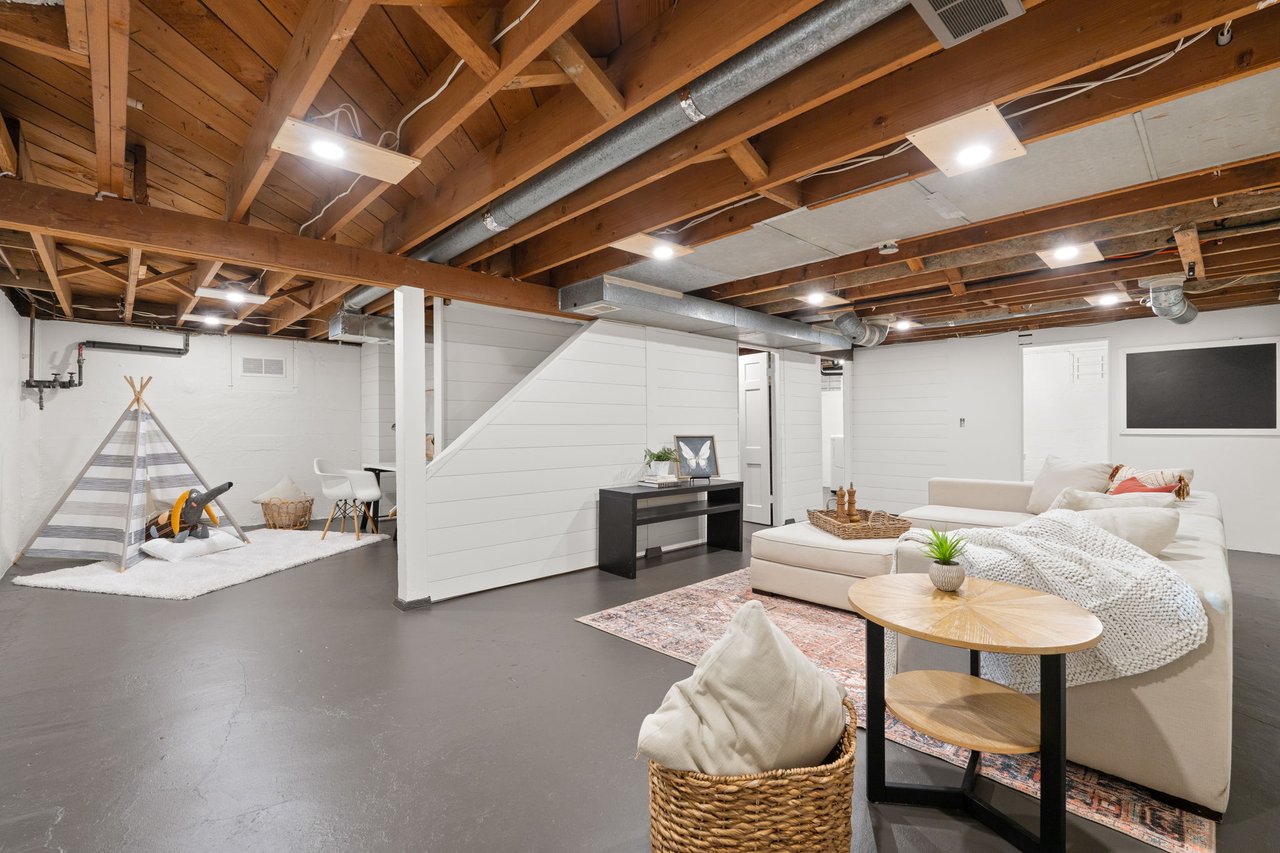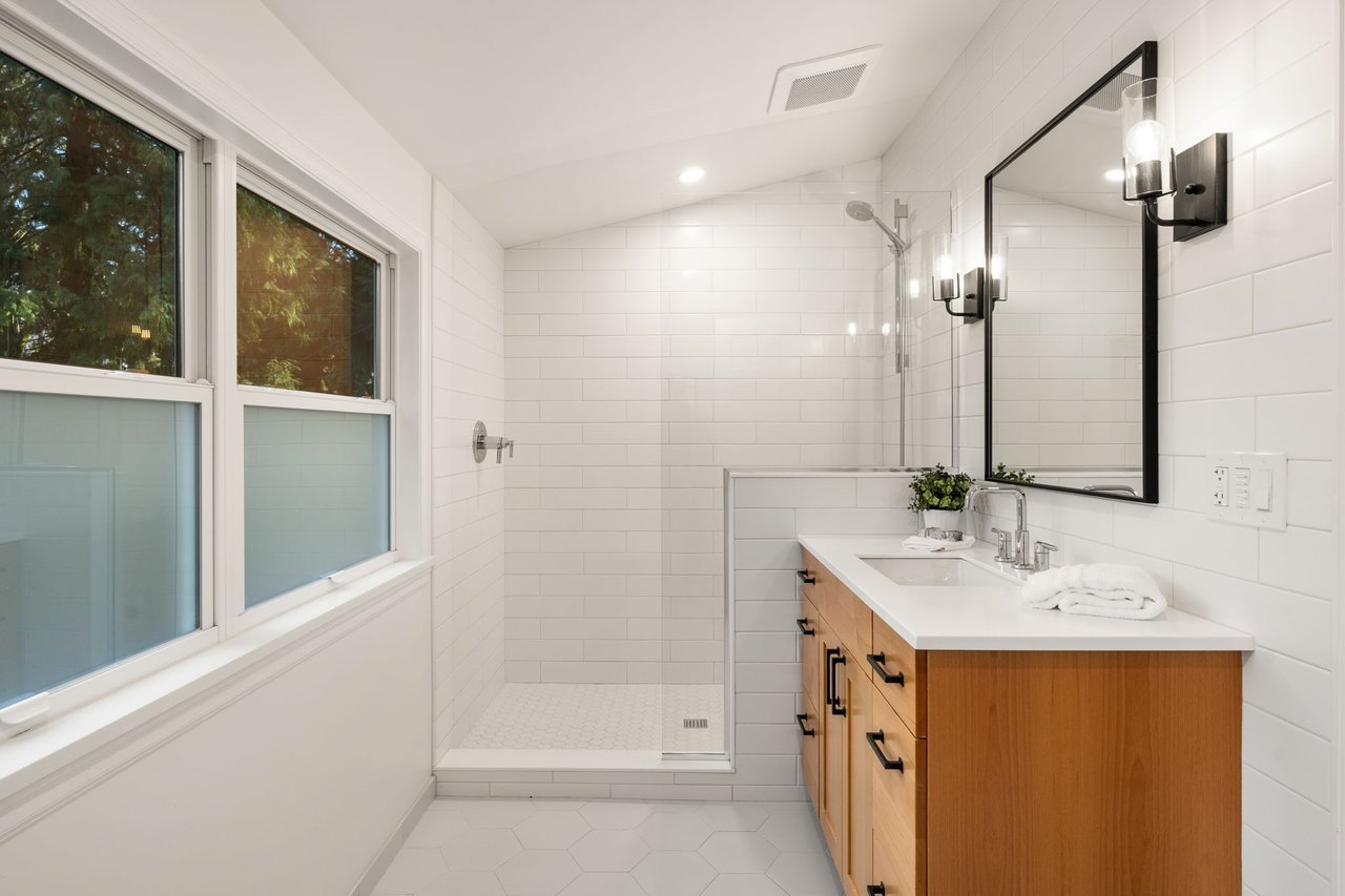 A main-level bedroom with a nearby full bathroom provides an ideal option for guests or single-level living. Upstairs, the primary suite serves as a private retreat with engineered hardwood floors and a stunning remodeled en suite bathroom featuring tile finishes and a walk-in shower. Two additional bedrooms share an updated bathroom with dual vanity and modern tilework. The lower level adds versatility with a spacious bonus room, half bath, laundry area, and ample storage.