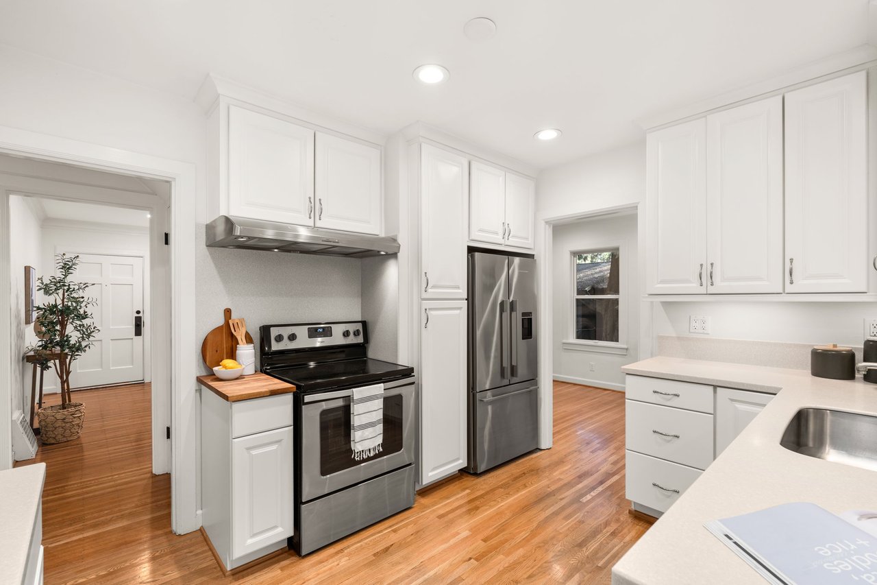 The main level is defined by hardwood floors, crown molding, and recessed lighting throughout. A formal living room with a wood-burning fireplace connects through a graceful arched opening to the dining room, creating an easy, elegant flow. From the dining area, French doors open to a sunroom with tile floors, exposed beams, and warm wood accents, an inviting space for relaxation. The kitchen includes stainless steel appliances, cabinet pantry storage, and a breakfast bar, and sits adjacent to the family room for convenient everyday living.