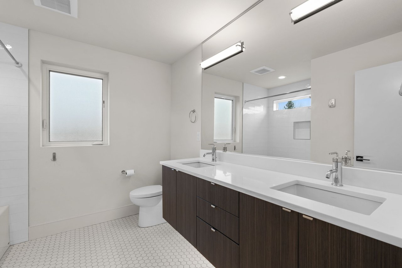 Upstairs, two generous bedrooms share a polished hallway bathroom with a double sink vanity and tile flooring. The primary bedroom includes a walk-in closet with built-in organization, and the laundry on this level adds everyday convenience.